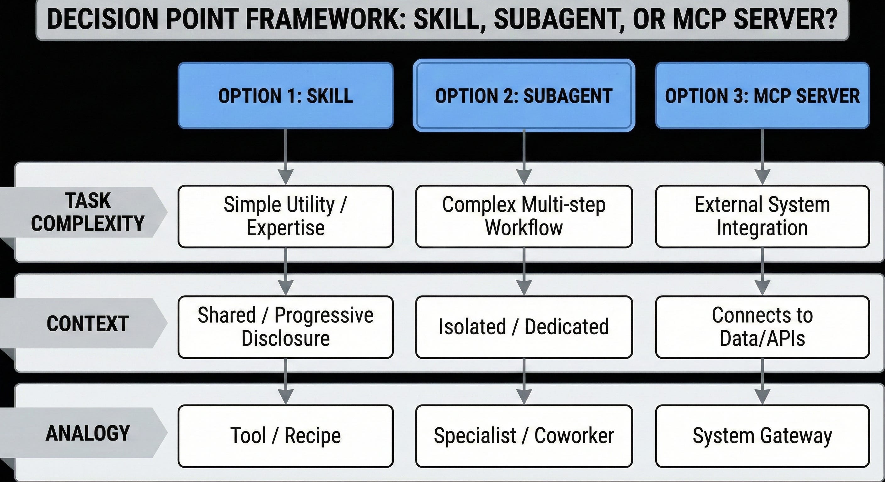 The choice between skills, subagents, and MCP servers maps directly to your architectural needs: skills for portable expertise, subagents for context isolation, MCP for external access. Most production workflows combine all three, using skills for domain knowledge, subagents for workflow orchestration, and MCP for system integration.